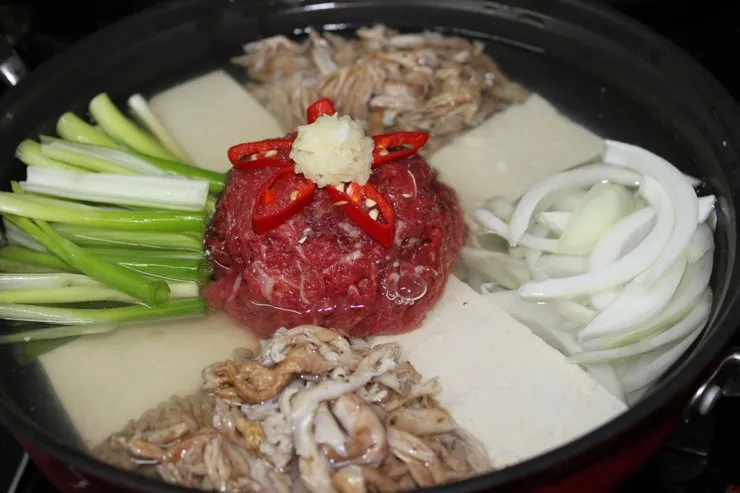 냄비에 다시마 육수를 넣고 끓이다가 소고기를 먼저 넣어주세요. 소고기가 익으면 싸리버섯과 두부를 넣습니다.