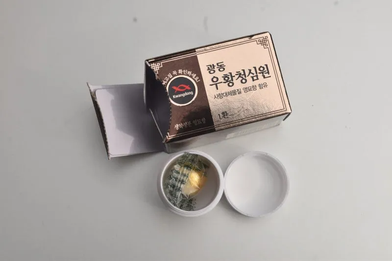 천연 우황이 아닌 체외배육우황 같은 대체우황을 쓸 수도 있어요. 가격은 천연우황의 10% 수준이지만 국내 식약처가 인정한 원료는 아닙니다.
