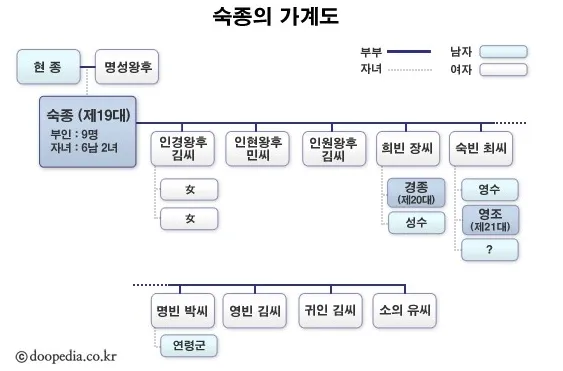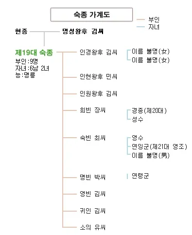 후궁으로는 희빈 장씨 외에도 숙빈 최씨, 명빈 박씨, 영빈 김씨 등이 있었는데, 특히 숙빈 최씨는 영조의 어머니로서 훗날 조선왕실의 중요한 인물이 됩니다.