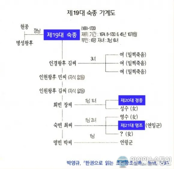 가계도를 보면 숙종에게는 경종(희빈 장씨 소생), 영조(숙빈 최씨 소생), 연령군(영빈 김씨 소생) 세 아들이 있었어요. 이 중 경종과 영조가 차례로 왕위에 올랐죠.